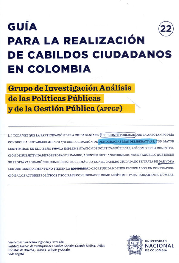 El Cabildo Ciudadano es la primera aplicaci?n y adaptaci?nen Colombia de las Conferencias de Consenso, metodolog?a participativaampliamente usada en el mundo. La gu?a es resultado de la experiencia adquiridacon la ejecuci?n del proyecto ?Prototipo de metodolog?a de participaci?n en pol?ticapublica: conferencia ciudadana en eutanasia infantil (ni?os, ni?as yadolescentes)? (2019-2020). Encontrar? en esta gu?a los fundamentos te?ricos,las innovacion...